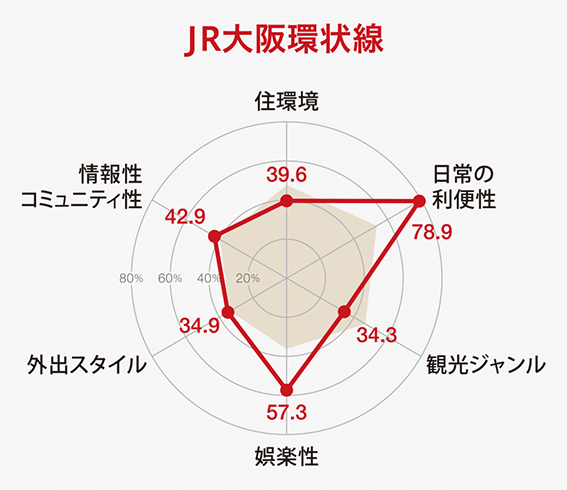 バリューイメージの各項目がいずれも平均スコアに近いのは、JR宝塚線・神戸線(2)、大阪メトロ谷町線・中央線、京阪本線、近鉄大阪線・奈良線等の沿線。中でもJR宝塚線は全ての項目がほぼ平均値で最も平均的なバリューイメージを有する沿線といえます。