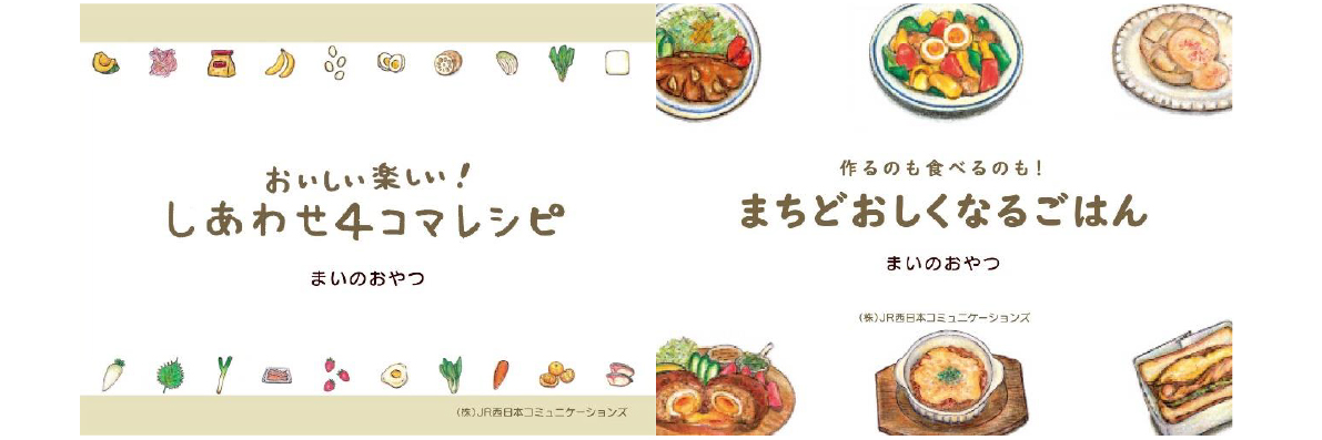 JR 西日本の車内サイネージ WEST ビジョンで、SNS で人気の「まいのおやつ」の書籍「おいしい楽しい! しあわせ 4 コマレシピ」「作るのも食べるのも! まちどおしくなるごはん」に掲載のレシピをご紹介する動画コンテンツを放映します。