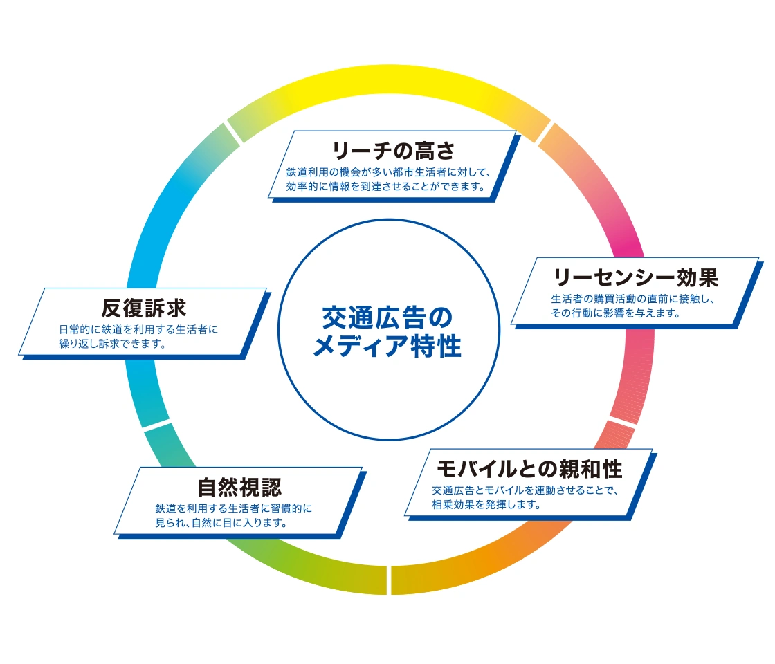 鉄道利用者の日常動線上で、繰り返し自然に接触できる交通広告は、高いリーチ力と記憶定着を実現します。購買や行動直前の接点としても機能し、モバイル連動による相乗効果も期待できます。