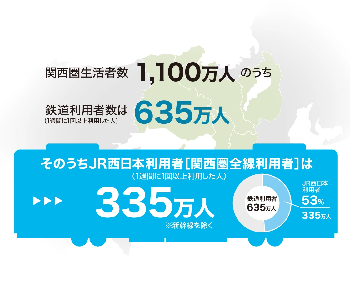 関西圏の鉄道利用者約635万人のうち、JR西日本の利用者は約335万人。関西生活者の半数以上に接触できるネットワークを有し、広域かつ安定した情報到達を実現します。