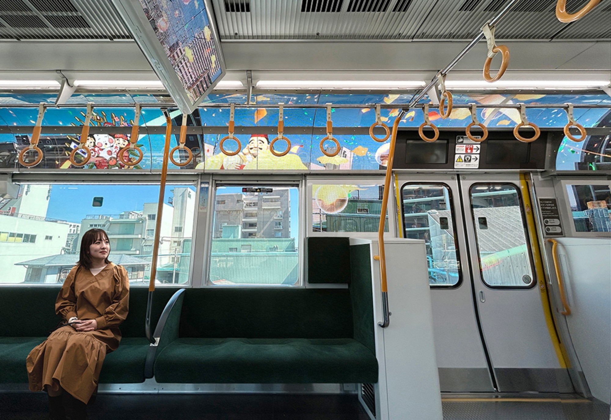 客室全長にわたって設置したLEDパネルに、外の景色をリアルタイムで映し出すライブ映像や走行エリアごとに「食」「歴史」「水都」「自然」「大阪・関西万博」「EXPOタイムトンネル」の6つの大阪をテーマにしたコンテンツを用いたAR技術により、パレードに包まれるオープンカーのような開放感を演出しました。