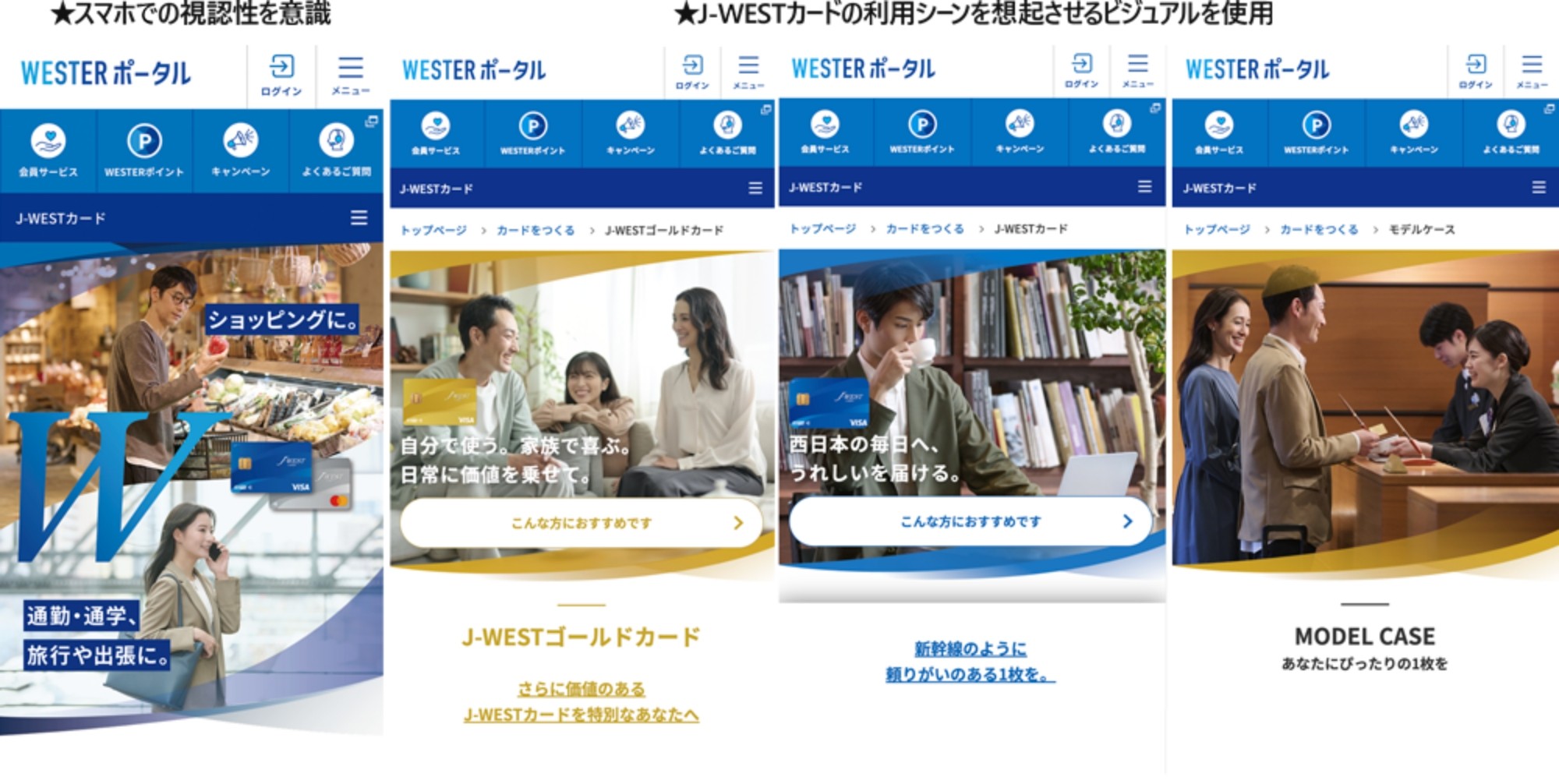 J-WESTカードの目標入会者数の達成に向け、WEBサイトをリニューアルしました。WEBサイト上でJ-WESTカードの魅力と利用シーンが伝わるクリエイティブとなるよう注力しました。また、調査データより、近年スマートフォン端末からのクレジットカード入会者が増えているというファクトを捉え、スマホから見やすいデザインや、入会を促す導線設計にも力を入れました。